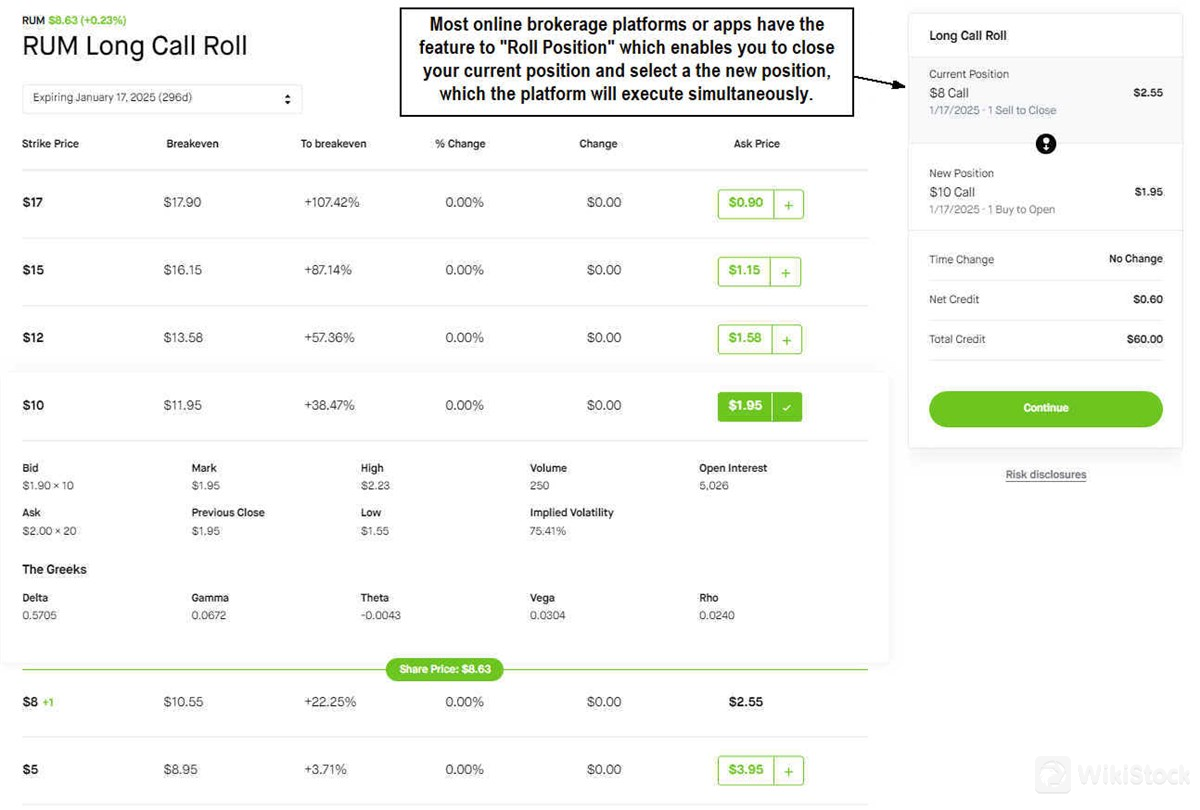 Since the position is ITM, we expect it to continue higher for the coming weeks to months. We decide to roll up the option position from the $8 strike price to the $10 strike price. Since we own 1 RUM $8 call expiring on Jan. 17, 2025, we can select the roll position feature and pick the new position, which will be the RUM $10 call with the same expiration.
