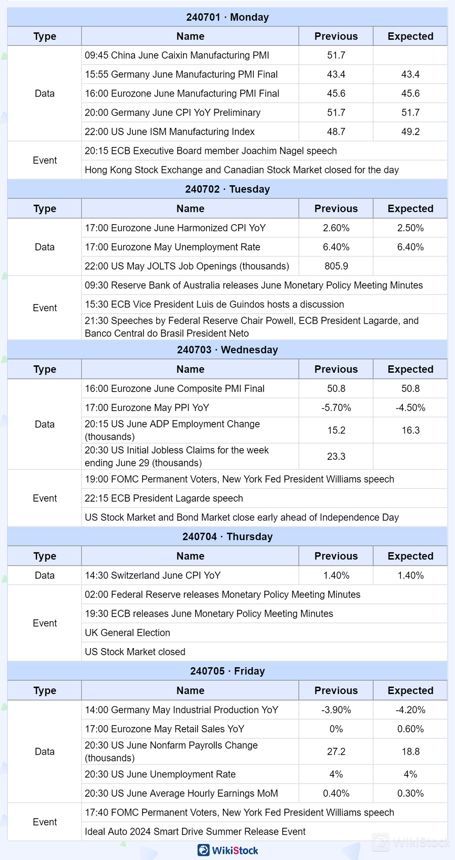 This week will also release China's June Caixin PMI data. Previous data showed that China's Caixin manufacturing PMI rose to 51.7 in May, reaching a new high since July 2022; the service PMI was 54, reaching a new high since August 2023.