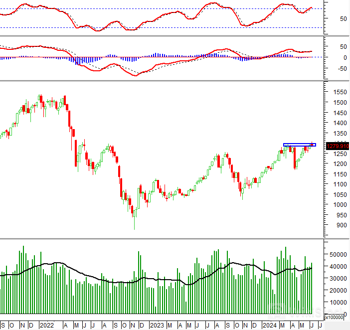 Trong khung thời gian tuần (10-14/06/2024), VN-Index quay lại giảm điểm và chấm dứt đà tăng so với tuần trước đó. Điều này cho thấy áp lực bán mạnh đang hiện diện khi chỉ số test lại đỉnh cũ tháng 3/2024 (tương đương vùng 1,280-1,295 điểm).