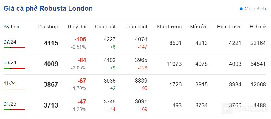 Cà phê Robusta giao dịch trên sàn ICE Futures Europe (sàn London) mở cửa lúc 16:00 và đóng cửa lúc 00:30 (hôm sau), giờ Việt Nam.