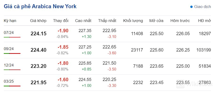 Cà phê Arabica trên sàn ICE Futures US (sàn New York) mở cửa lúc 16:15 và đóng cửa lúc 01:30 (hôm sau), giờ Việt Nam.
