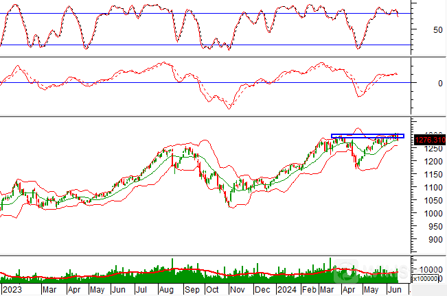 Bên cạnh đó, giá cổ phiếu đang bám sát dải trên (Upper Band) của Bollinger Band trong bối cảnh chỉ báo MACD đang không ngừng mở rộng khoảng cách với đường Signal sau khi cho tín hiệu mua trước đó càng củng cố thêm sức mạnh cho xu hướng hiện tại của cổ phiếu.
