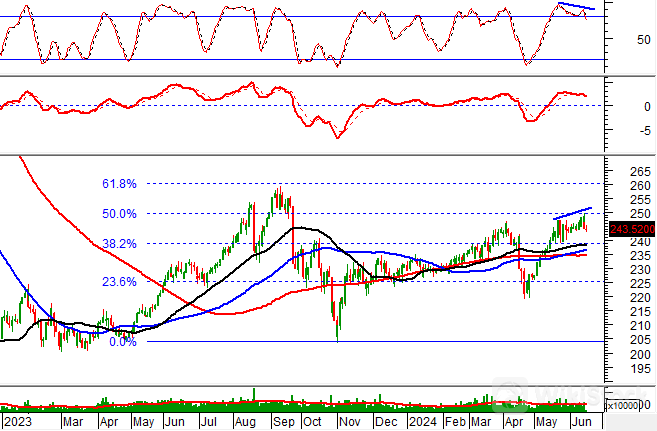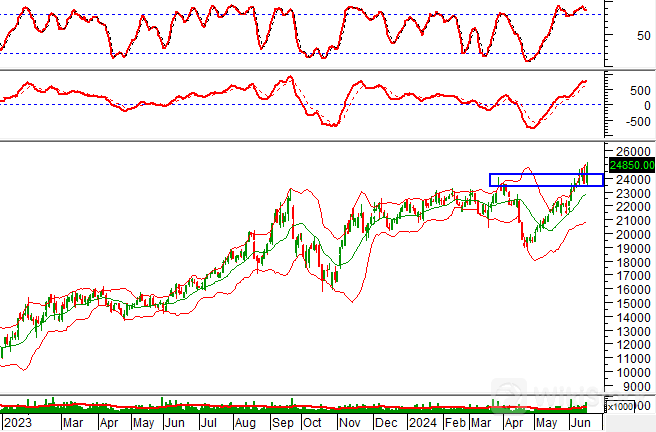 Cùng với đó, giá cổ phiếu test thành công đỉnh cũ tháng 3/2024 (tương đương vùng 23,300-24,300) đồng thời xác lập đỉnh 52 tuần mới cho thấy triển vọng lạc quan dài hạn đang dần hiện hữu.