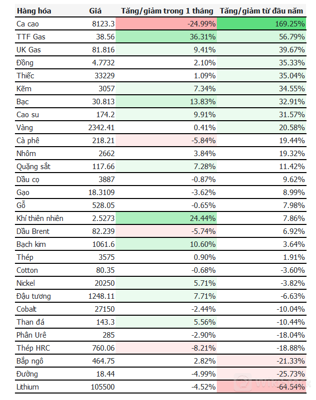 Trong đó, giá ca cao đã đạt mức kỷ lục, còn khí đốt chuẩn châu Âu cũng tăng mạnh do sự cố giàn khoan Na Uy, cho thấy tính dễ tổn thương của thị trường khi phụ thuộc vào nhập khẩu khí đốt. Trong khi đó, giá đồng, vàng và bạc cũng chứng kiến những bước tăng ấn tượng nhờ sự hồi phục kinh tế và biến động địa chính trị.