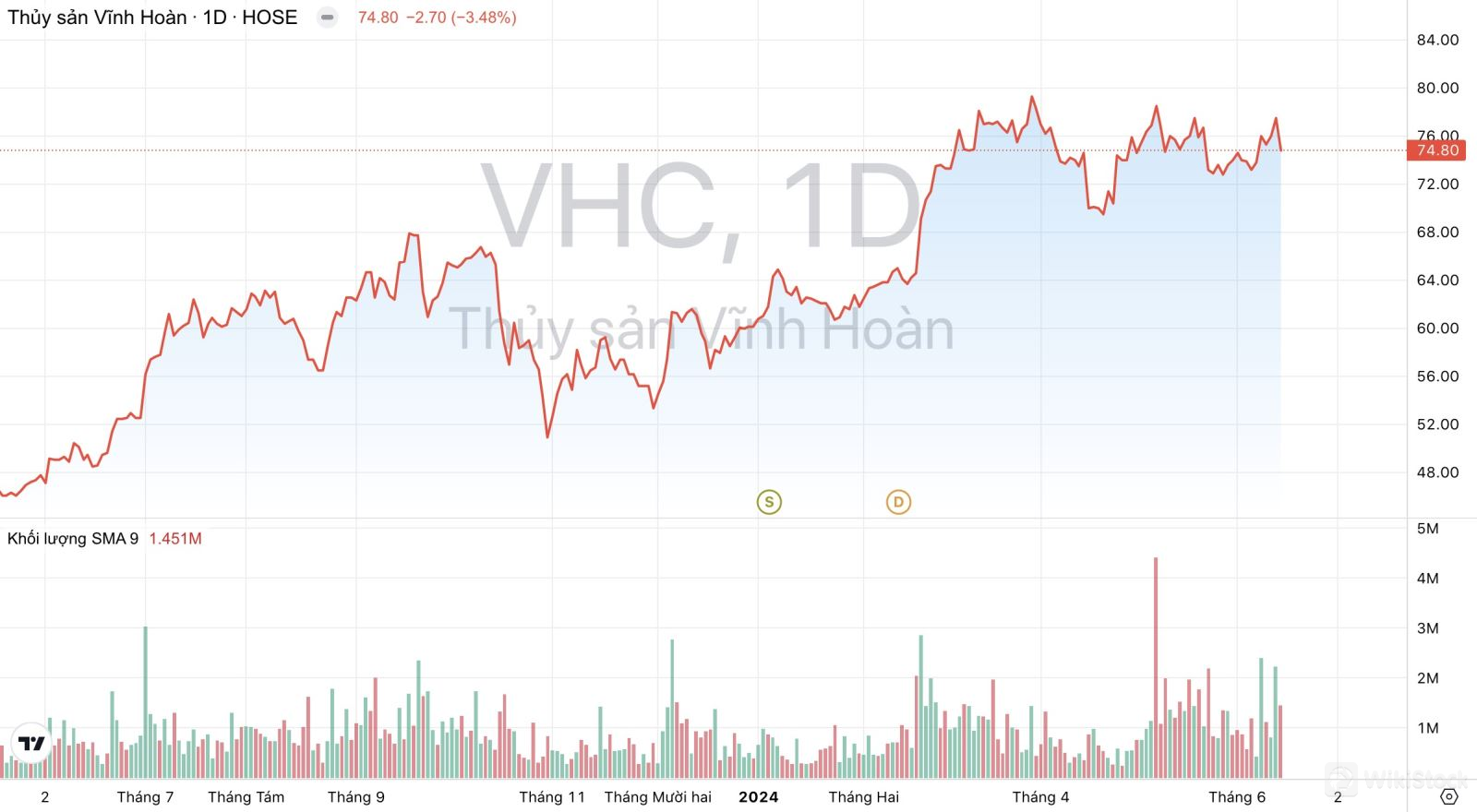 Khối lượng giao dịch và xu hướng giá cổ phiếu VHC của Thủy sản Vĩnh Hoàn trong vòng 12 tháng qua. (Nguồn: TradingView)