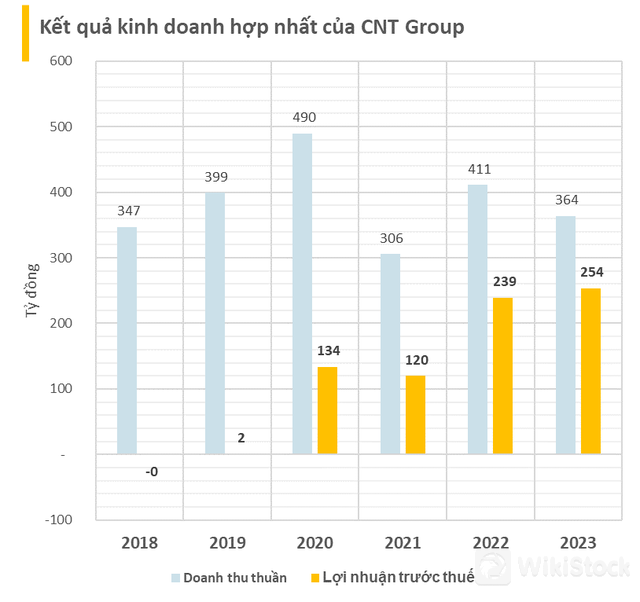 Về kết quả kinh doanh, kể từ năm 2020 đến nay, lợi nhuận trước thuế của CNT Group đều lãi hơn 100 tỷ mỗi năm. Năm 2023, dù doanh thu giảm hơn 11% đạt 364 tỷ đồng, nhưng lợi nhuận trước thuế tăng 6% đạt 254 tỷ đồng nhờ doanh thu tài chính tăng và chi phí bán hàng và chi phí quản lý doanh nghiệp giảm mạnh.