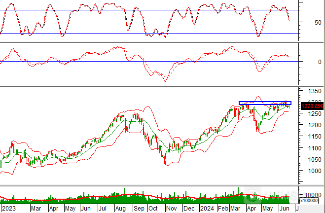 Bên cạnh đó, giá cổ phiếu bật tăng sau khi test thành công đường Middle của Bollinger Bands trong bối cảnh chỉ báo MACD đang không ngừng mở rộng khoảng cách với đường Signal sau khi cho tín hiệu mua trước đó càng củng cố thêm sức mạnh cho xu hướng hiện tại của cổ phiếu.