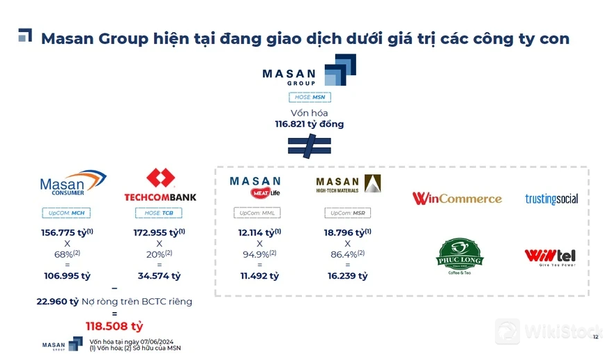 Cụ thể, tại ngày 7/6, vốn hóa Masan đạt 116.821 tỷ đồng và tổng giá trị vốn hóa phần sở hữu tại Masan Consumer và Techcombank là 118.508 tỷ đồng (đã trừ nợ ròng trên báo cáo tài chính riêng). Những con số này phản ánh giá trị vốn hóa của chỉ riêng công ty thành viên, công ty liên kết của Masan là Masan Consumer và Techcombank đã bằng, thậm chí vượt giá trị vốn hóa của Masan.