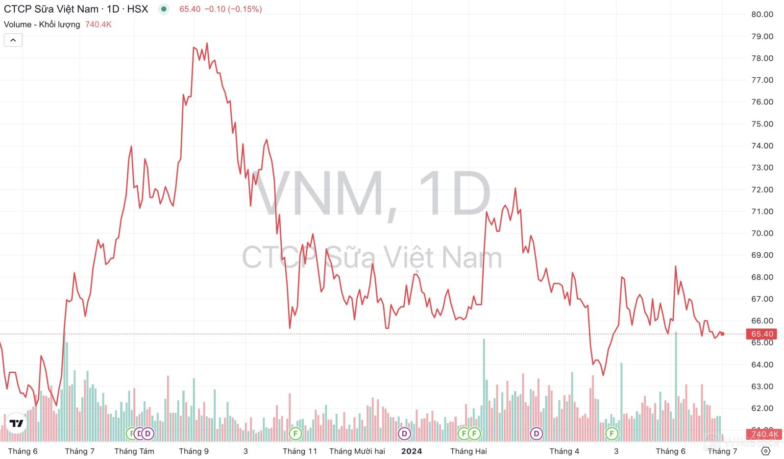 Khối lượng giao dịch và xu hướng giá cổ phiếu VNM của Vinamilk trong 12 tháng qua. (Nguồn: TradingView)