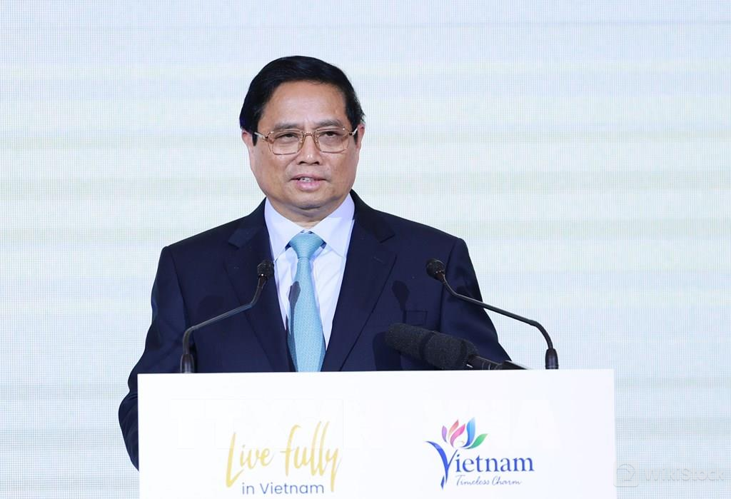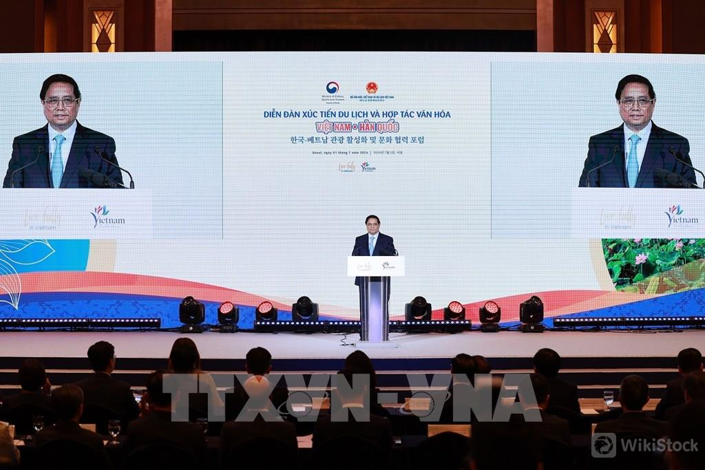 Thủ tướng Phạm Minh Chính phát biểu tại Diễn đàn Xúc tiến du lịch và Hợp tác văn hóa Việt Nam – Hàn Quốc. Ảnh: Dương Giang-TTXVN