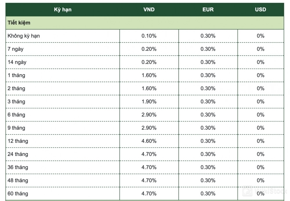 Đối với các kỳ hạn dài từ 24 tháng đến 60 tháng, khách hàng gửi tiết kiệm tại Vietcombank sẽ được nhận mức lãi suất ưu đãi nhất là 4,7%/năm.