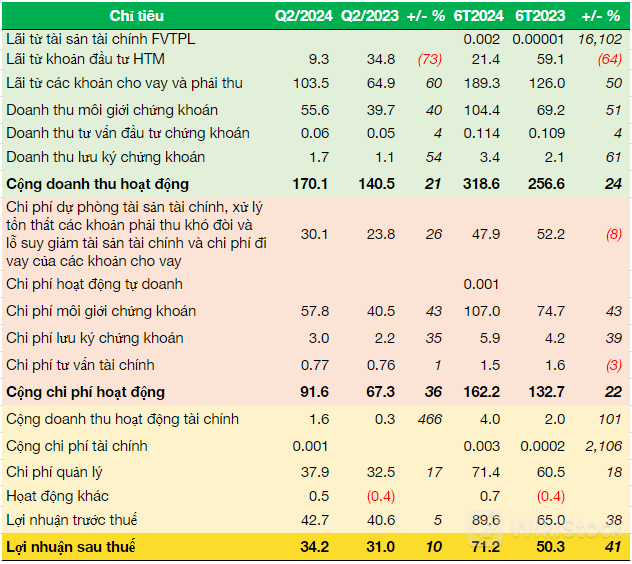 Trong quý 2/2024, doanh thu hoạt động của Yuanta đạt trên 170 tỷ đồng, tăng 21% so với cùng kỳ năm trước. Động lực chính đến từ lãi các khoản cho vay và phải thu tăng 60% lên gần 104 tỷ đồng, bên cạnh doanh thu môi giới tăng 40% lên gần 56 tỷ đồng.