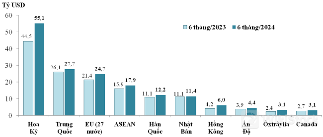 Cụ thể, trong 6 tháng năm 2024 so với cùng kỳ năm trước, trị giá xuất khẩu sang thị trường Hoa Kỳ đạt 55,1 tỷ USD, tăng tới 24% (tương ứng tăng 10,7 tỷ USD), chiếm 29% trong tổng trị giá xuất khẩu của cả nước; EU (27 nước) đạt 24,7 tỷ USD, tăng 15,3% (tương ứng tăng 3,3 tỷ USD); Trung Quốc đạt 27,7 tỷ USD, tăng 6,2% (tương ứng tăng 1,6 tỷ USD); ASEAN 17,9 tỷ USD, tăng 12,2% (tương ứng tăng 2 tỷ USD); Hồng Kông đạt 6 tỷ USD, tăng 41,8% (tương ứng tăng 1,8 tỷ USD); Hàn Quốc là 12,2 tỷ USD, tăng 10,5%, tương ứng tăng 1,1 tỷ USD so với cùng kỳ năm trước.