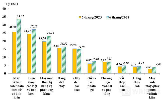 Trong 6 tháng năm 2024 có tới 5 nhóm hàng xuất khẩu tăng trên 1 tỷ USD so với cùng kỳ năm trước. Dẫn đầu là nhóm hàng máy vi tính, sản phẩm điện tử và linh kiện tăng 8,07 tỷ USD; tiếp theo là nhóm hàng máy móc, thiết bị, dụng cụ, phụ tùng tăng 3,42 tỷ USD; điện thoại các loại và linh kiện tăng 2,7 tỷ USD; gỗ và sản phẩm gỗ tăng 1,41 tỷ USD; máy ảnh, máy quay phim và linh kiện tăng 1,36 tỷ USD. Tính chung, tổng trị giá xuất khẩu 5 nhóm hàng này tăng 16,96 tỷ USD so với cùng kỳ năm trước và bằng 68,5% mức tăng trị giá xuất khẩu của cả nước.
