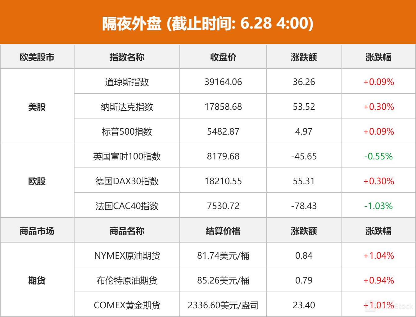 美股市场:美股三大指数小幅收涨,截至当天收盘,道琼斯工业平均指数比前一交易日上涨36.26点,收于39164.06点,涨幅为0.09%;标准普尔500种股票指数上涨4.97点,收于5482.87点,涨幅为0.09%;纳斯达克综合指数上涨53.52点,收于17858.68点,涨幅为0.30%。