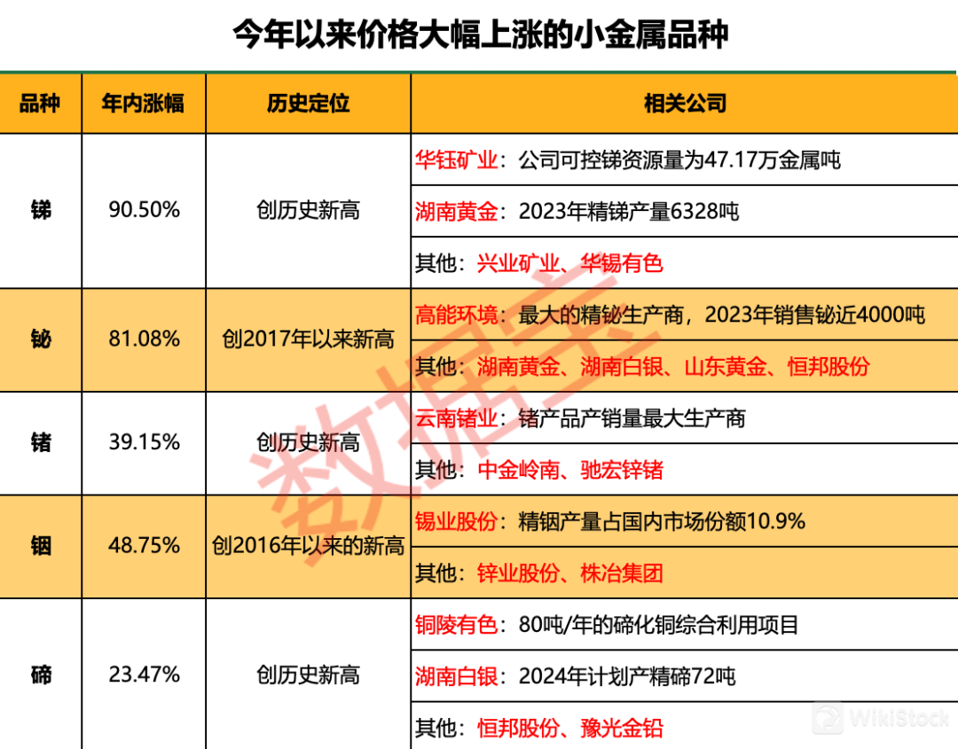 今年以来,多个小金属价格大幅上涨。今年以来,在有色金属大涨的带领下,部分小金属价格大幅上涨,多个品种创下数年来的新高甚至历史新高。小金属由于矿产分布分散,总体产能有限且多是伴生矿,价格容易受到少数头部