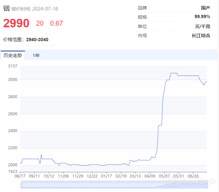 2023年年末,铟价格为2010元/千克,最新价格为2990元/千克,年内价格涨幅达到48.75%,创2016年以来新高。