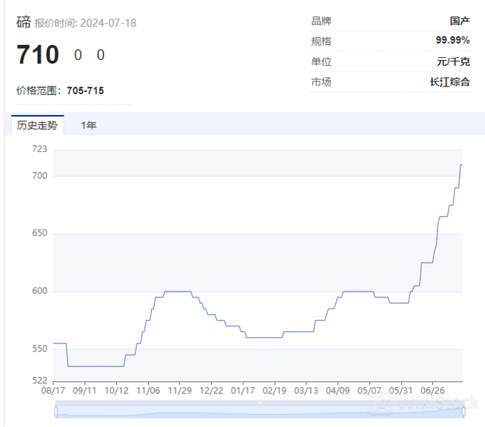2023年年末,碲价格为575元/千克,最新价格为710元/千克,年内价格涨幅达到23.47%,创历史新高,为首次突破70万元/吨。
