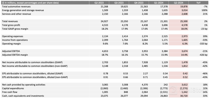 7月24日,特斯拉发布的财报显示,公司第二财季营收255亿美元,同比增长2%,高于分析师预期的245.4亿美元;净利润为14.78亿美元,同比下降45%,低于分析师预期的18.06亿美元;调整后每股收益0.52美元,低于上年同期的0.91美元,亦低于分析师预期的0.6美元;毛利率为18%,高于分析师预期的17.4%。
