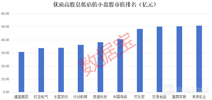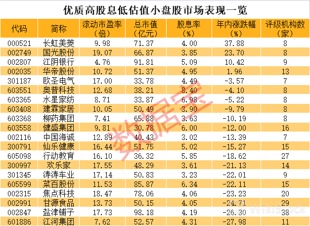 数据宝筛选出优质低估值小盘股,条件包括:1. 评级机构数在5家以上;2. 调高今年预测净利的机构数多于调低机构数;3. 市值低于百亿元;4. 滚动市盈率低于20倍;5. 最新市盈率处于历史百分位的10%以下;6. 最新股息率在3%以上;7. 去年扣非加权ROE超10%。