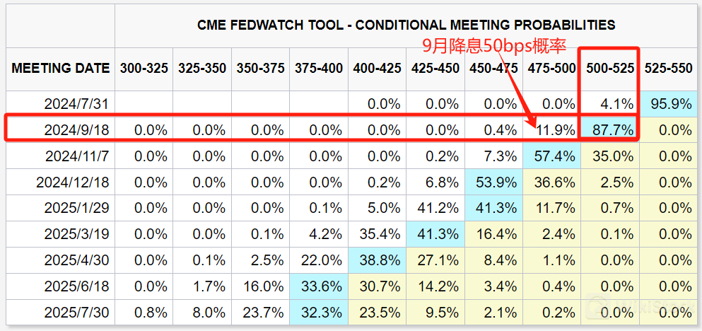 上图还显示,交易商甚至押注美联储会在9月份一次性大幅降息50基点,但目前概率只有不到12%。
