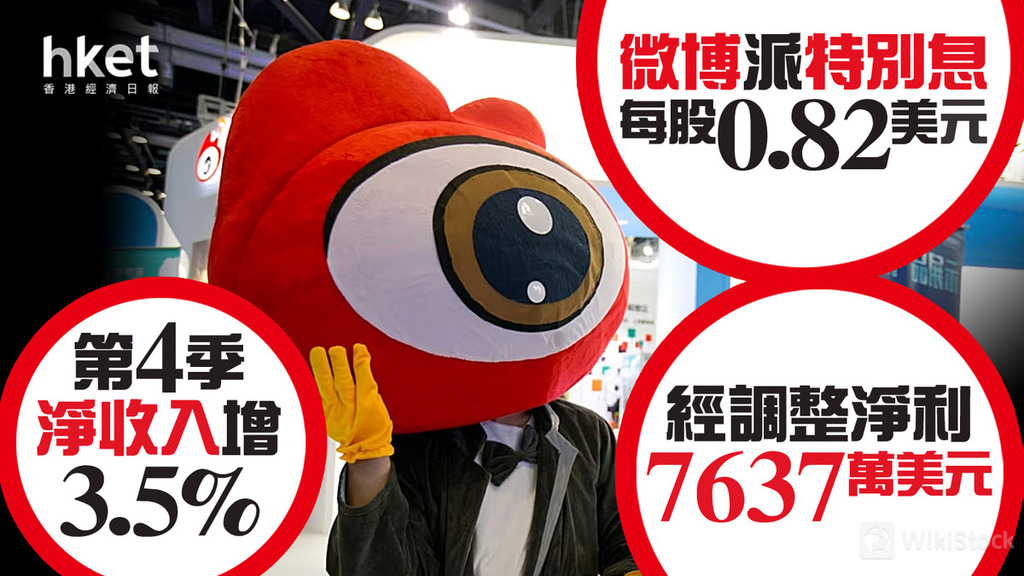 (美:WB)公布,2023年第4季淨收入4.64億美元,按年增3.5%;純利8323萬元,按年跌41.4%;經調整純利7636.6萬元,按年跌57.2%。微博宣派特別息,每普通股及ADS派0.82美元。微博股價績後逆市向上,高開1.5%,開報78.25元。